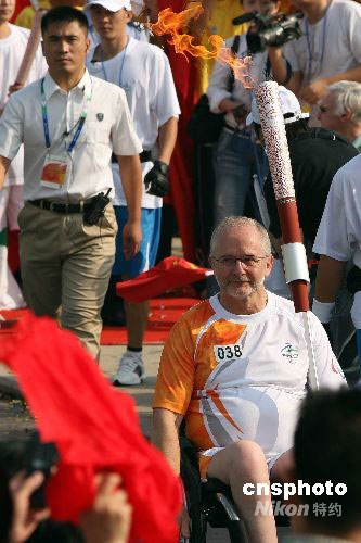 火炬手、國際殘奧委會(IPC)主席菲利普·克雷文(Philip Craven)傳遞火炬。中新社發(fā) 張宇 攝