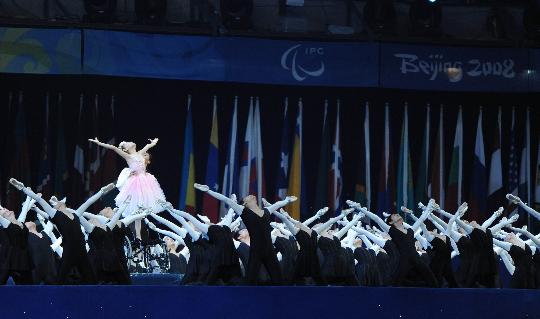 9月6日20時(shí),北京2008年殘奧會(huì)開(kāi)幕式在國(guó)家體育場(chǎng)“鳥(niǎo)巢”舉行,圖為開(kāi)幕式上的文藝表演《太陽(yáng)鳥(niǎo)》。 中新社發(fā) 盛佳鵬 攝
