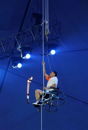 而點(diǎn)燃主火炬的侯斌與李寧相比則更顯得堅(jiān)毅向上。這位三屆殘奧會(huì)跳高金牌得主坐在輪椅上,一點(diǎn)一點(diǎn)的用手拉著繩索向上攀爬,并最終用火炬點(diǎn)燃了主火炬。他艱辛的上升過程,也牽動(dòng)了所有觀看點(diǎn)火儀式的觀眾的心。不過,他用成功證明了自己,點(diǎn)燃了北京殘奧會(huì)的熊熊圣火。