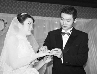 劉煒深情地為新娘戴上婚戒 洪南麗