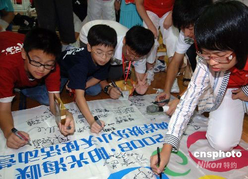 圖為臺(tái)北光復(fù)小學(xué)學(xué)生與福建小營員們共同在“2008·陽光海峽”兩岸快樂小天使活動(dòng)營旗上簽名。
