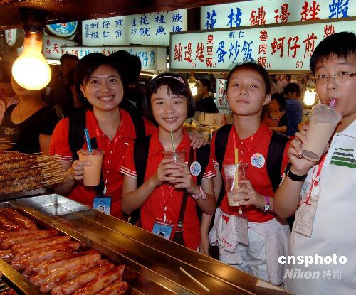福建小營(yíng)員夜游臺(tái)北“士林夜市”,品嘗當(dāng)?shù)靥厣〕。中新社發(fā) 劉可耕 攝