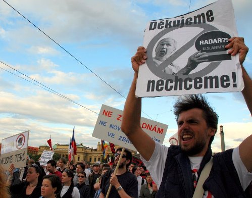 資料圖片:數(shù)千捷克民眾今年8月8日在布拉格舉行示威游行,抗議政府簽約同意美國(guó)在捷克建立反導(dǎo)雷達(dá)基地。這位示威者舉著的標(biāo)語(yǔ)寫(xiě)道:“謝謝,我們不要美國(guó)雷達(dá)!” (攝影:黃頻/中歐社)