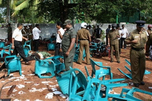 10月6日,在斯里蘭卡北部阿努拉德普勒鎮(zhèn),安全人員查看爆炸現(xiàn)場(chǎng)。當(dāng)天上午,一名自殺式襲擊者在阿努拉德普勒鎮(zhèn)老汽車站附近引爆了身上的炸彈。包括斯前陸軍參謀長(zhǎng)佩雷拉及其夫人在內(nèi)的至少27人在爆炸中死亡。