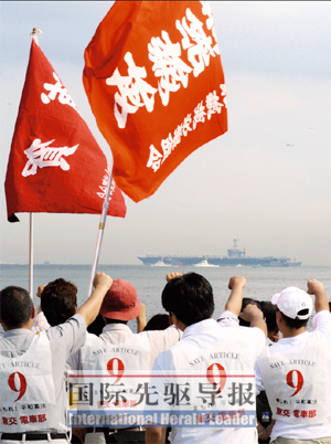 國際先驅(qū)導(dǎo)報記者劉贊 特約撰稿秦帆發(fā)自東京 結(jié)束采訪走出美軍基地時,基地大門前多了一隊全副武裝的防暴警察,一副嚴(yán)陣以待的架勢。兩名站崗的警察告訴《國際先驅(qū)導(dǎo)報》記者,平時基地門口就只有他們值班,但當(dāng)天為防止市民們抗議示威而增加了警力。此時在能看到航母經(jīng)過的岸邊,已聚集了數(shù)百名反對“華盛頓”號進駐的居民揮舞拳頭高喊:“‘華盛頓’號滾回家去!”