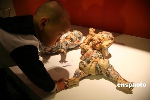 圖為一名兒童正在觀看“結(jié)石寶寶”陶瓷作品。