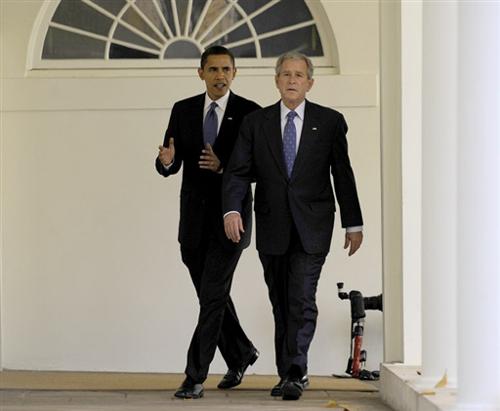 布什表現(xiàn)得熱情好客,雖然在美國總統(tǒng)選舉過程中他被民主黨的奧巴馬當(dāng)成攻擊其所在的共和黨候選人的反面教材,但是布什夫婦還是鋪好了紅地毯,讓奧巴馬夫婦踏足。這似乎也在寓意著一個美好的愿望——在奧巴馬的任期內(nèi),美國人能擺脫經(jīng)濟危機,重新過上紅火的日子。