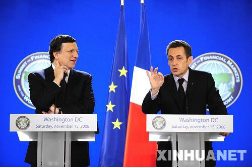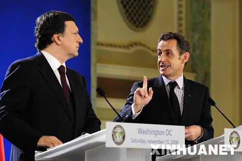 11月15日,在美國(guó)首都華盛頓出席二十國(guó)集團(tuán)領(lǐng)導(dǎo)人金融市場(chǎng)和世界經(jīng)濟(jì)峰會(huì)的法國(guó)總統(tǒng)薩科齊(右)和歐盟委員會(huì)主席巴羅佐聯(lián)合舉行新聞發(fā)布會(huì)。 新華社記者張巖攝