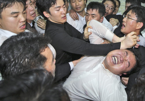民主黨議員甚至動員錘子和起釘器打開大門,試圖闖進會議室,而執(zhí)政黨用桌子和椅子來圍堵會場,并噴灑滅火器等強烈阻止他門進入,朝野黨議員之間發(fā)生了激烈的沖突。沖突中一人頭部流血,另一人被打掉了幾顆牙齒。有幾扇門被打倒,門后防線內(nèi)的桌子被打成碎片。