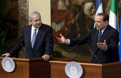 在兩位領(lǐng)導人召開的一場持續(xù)了近兩個小時的聯(lián)合記者招待會上,貝盧斯科尼表示,意方同意內(nèi)塔尼亞胡關(guān)于建立一個非軍事化的巴勒斯坦國的看法。他表示,意大利贊同“建立這樣的國家”,正如意大利認為以色列“應(yīng)獲得阿拉伯國家的承認”一樣。