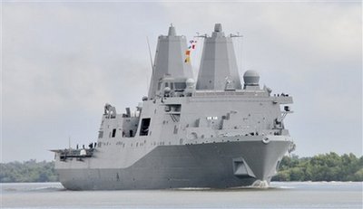 這艘軍艦是美國(guó)圣安東尼奧級(jí)船塢登陸艦的第六艘,全長(zhǎng)二百零八米,船員二百九十名。來自世貿(mào)中心的鋼材于被用于制造“紐約號(hào)”上的兩棲登陸平臺(tái),“它可以讓一支七百人的海軍陸戰(zhàn)隊(duì)在任何地方登陸”,美國(guó)海軍少?碌偎埂き偹拐f。目前“紐約號(hào)”的主要任務(wù),正是將美國(guó)海軍部署到反恐行動(dòng)現(xiàn)場(chǎng)。