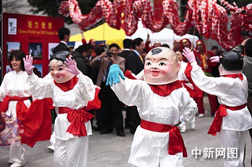 春節(jié)祭開場,各式中國傳統(tǒng)民俗表演讓日本當?shù)厝烁惺艿搅酥袊鴿鉂獾哪晡。舞龍、旱船、大頭娃娃、太極拳,場面分外熱鬧。