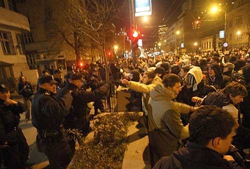 據(jù)聯(lián)合早報(bào)網(wǎng)報(bào)道,大約一千名憤怒的塞族青年,到美國(guó)大使館、一間美式快餐店和歐盟輪任主席國(guó)斯洛文尼亞大使館投擲石塊,并與防暴警察沖突,示威者又拆去歐盟旗幟,示威者又縱火、燒車,打爛大使館的玻璃窗。防暴警察以催激氣體及橡膠子彈驅(qū)散,又施放催淚氣體和出動(dòng)警棍驅(qū)散。