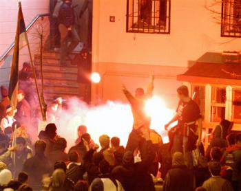 事件發(fā)生時,至少有15萬塞族示威者在貝爾格萊德市中心舉行集會,塞爾維亞總理科什圖尼察對示威者發(fā)表了譴責(zé)科索沃獨立的激情演講。大部分塞族人把科索沃視作塞爾維亞的宗教和文化發(fā)源地。