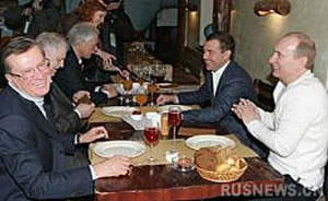 當他們五個人在名為“遠征”的飯店就座后,普京向擔任國家公職前曾多次參加地質(zhì)考察的米羅諾夫詢問道:“您去過‘考察’多少年?”(在俄文中,“考察”和“遠征”是同一個詞)。普京借此開玩笑建議聽取米羅諾夫的點菜經(jīng)驗。在眾人的笑聲中米羅諾夫回答到:“18年。現(xiàn)在就開始第19個年頭了!