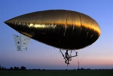 據悉,他的飛艇長16米,裝有兩個螺旋槳推進器,靠腳踏推動,是全球第一艘同類型的腳踏飛船。