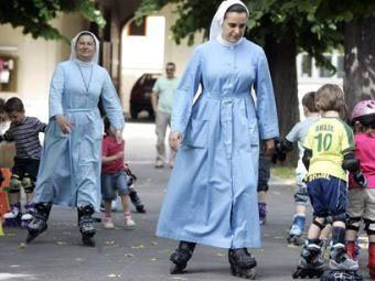 老師們(穿著修女服飾)穿著輪滑在照顧孩子