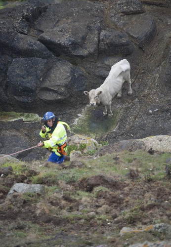 順繩索下到山澗的海岸警衛(wèi)隊員給公牛帶來了食物和水。