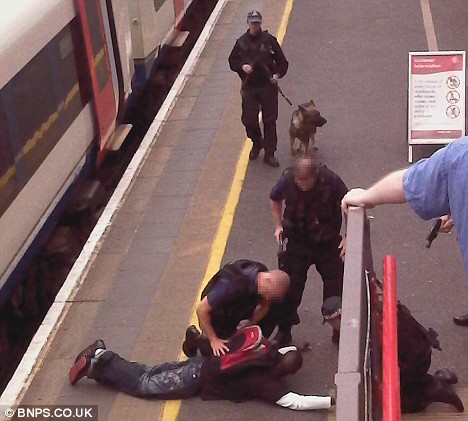 就在英國警方抓捕這名無辜男子時,一名在現(xiàn)場的乘客使用手機拍下了有關(guān)過程。有目擊者對記者說,“當時有很多人都在排隊買票,但突然有多名全付武裝的警察沖進車站,他們的人數(shù)大約有10個人,有些警察拿著手槍,另外還有一條警犬。我聽見有人說:不要讓任何人走下火車或者離開站臺。隨后火車站所有的出口都被封鎖了。火車的車門打開后,那名男子剛一走下站臺,就被命令趴在地上,他被要求伸開雙手并靠攏雙腿。警方對這名男子的背包進行了認真的搜查,然后又把他帶到一間廢棄不用的盥洗間,可能是對他進行一步的搜查。這一幕真是讓人感到非?植。”