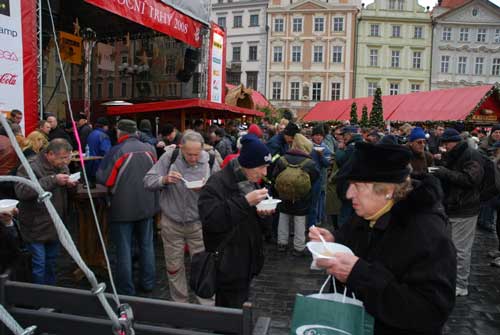 據(jù)報道,今年分發(fā)魚湯的份比去年增加了1/4,共分發(fā)了500份。前來喝湯的除了無家可歸的流浪者、領(lǐng)退休金者之外,不乏普通居民和好奇的外國游客。10年前創(chuàng)辦這項分發(fā)平安夜魚湯慈善活動的前布拉格市長揚(yáng).構(gòu)卡爾今年又來為大家分湯。(黃頻攝影報道)