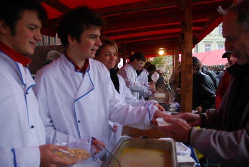 6年來布拉格市長貝姆第一次沒有親自操勺打湯,據(jù)說這位跑過馬拉松,登過珠峰的運(yùn)動愛好者人在南極,他的太太拉德米拉.貝娃帶著兩個兒子為市民服務(wù),向每一位領(lǐng)湯的人轉(zhuǎn)達(dá)她丈夫的節(jié)日問候。