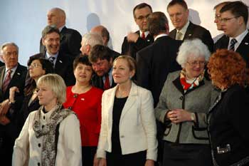 7日上午他們?cè)诜鼱査吆优系牧兄Ф厥康菍m會(huì)見了輪值主席國捷克的政府內(nèi)閣成員。官員們按照地上已標(biāo)好的名字“對(duì)名入站”,讓記者們拍攝合影。(黃頻)