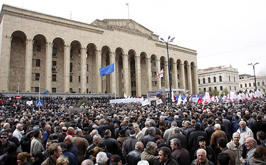 大約2萬名反總統(tǒng)薩卡什維利的示威者周五(10日)聚集在議會外。薩卡什維利早前要求與反對派進行對話,并保證改善該國民主。但薩卡什維利拒絕辭職。