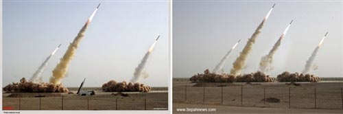 革命衛(wèi)隊前天向包括以色列在內(nèi)的世界各大傳媒發(fā)放了一批相片和錄像片段,在片段中其中一幕顯示3枚導(dǎo)彈以差不多角度射上天空,第4枚則仍在地上,可能因技術(shù)問題未能發(fā)射。但其中一張相片顯示在類似試射環(huán)境中,竟然多了一枚射上天空的導(dǎo)彈,而且地面的煙塵與最右邊的煙塵極之相似。