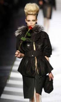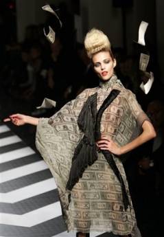 中新網(wǎng)3月10日電 據(jù)路透社報(bào)道,日前在法國(guó)知名時(shí)裝設(shè)計(jì)師高堤耶(Jean-Paul Gaultier)的服裝秀上,模特們身著用大把鈔票模樣堆砌而成的黑色禮服,而設(shè)計(jì)師克里斯汀-拉克魯瓦(Christian Lacroix)則設(shè)計(jì)出了巴洛克風(fēng)格的黃金禮服和大毛皮領(lǐng)。巴黎時(shí)裝展就是敢于走頹廢路線。