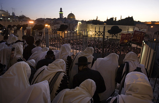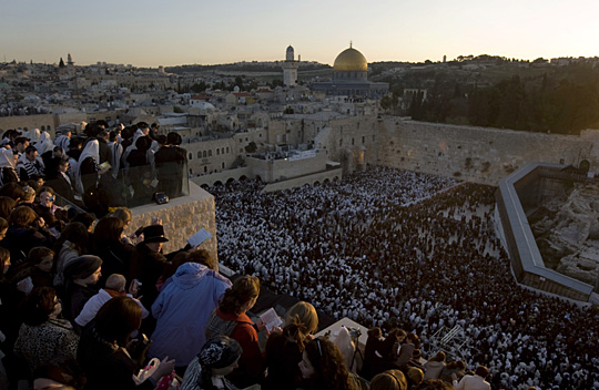 當(dāng)天哭墻前的廣場(chǎng)上擠滿了披著白色圍巾的男女老幼,周圍的房屋頂上也都人頭攢動(dòng),人們?cè)谶@里等待抓住當(dāng)天的第一道陽光。