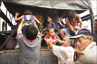 平板貨車、警方特許客貨車,甚至垃圾車均被征用接載災民離開(見圖)?偨y(tǒng)阿羅約夫人縮短新加坡訪問回國。