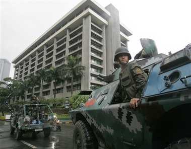 中新網(wǎng)11月29日電 綜合報道,曾發(fā)動兵變的菲律賓士兵29日占領(lǐng)馬尼拉半島酒店,要求總統(tǒng)阿羅約辭職。政府給予那些士兵的投降限期已屆滿。政府此前要求這些士兵在北京時間下午3點無條件投降。