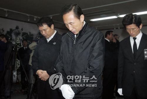 韓總統(tǒng)當(dāng)選人李明博慰問(wèn)冷庫(kù)爆炸遇難者家屬(圖)