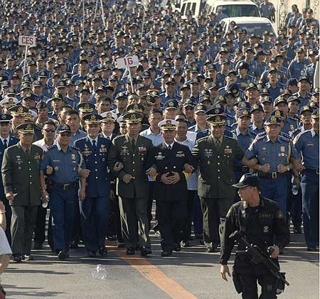 同時(shí),在可能發(fā)生兵變的傳聞滿天飛之際,數(shù)千高級(jí)軍警官員在具歷史性意義的埃剎圣壇,出席紀(jì)念人民力量革命活動(dòng)后,手挽手從埃剎圣壇“團(tuán)結(jié)步行”到大約有300米之遙的軍方總部,以示對(duì)阿羅約的效忠和支持。