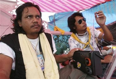 總理府外的反政府示威者在收聽沙馬的講話。