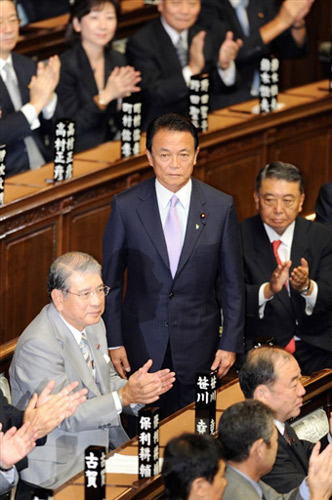 當?shù)貢r間24日13點30分,兩天前剛剛當選自民黨總裁的麻生太郎在眾議院全體會議上以337票被指定為第92任日本總理大臣。參議院隨后召開全體會議進行首相提名選舉,民主黨黨首小澤一郎當選。根據(jù)眾院表決結(jié)果優(yōu)先的日本憲法規(guī)定,麻生太郎經(jīng)兩院協(xié)商后確定出任首相。