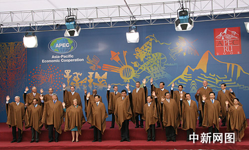 中午,與會(huì)各成員領(lǐng)導(dǎo)人身穿秘魯民族服裝集體合影。