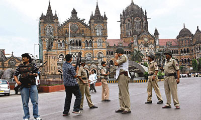 遇襲的查拉特巴蒂.席瓦吉火車站外,孟買警方搜索槍手。