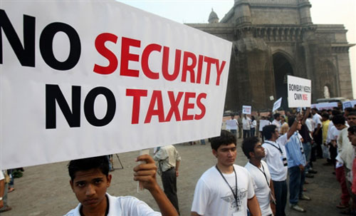 近萬名孟買市民3日晚上聚集到泰姬瑪哈酒店附近舉行游行示威,抗議政府反恐不力。