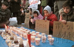 在日本警方的關(guān)注下,抗議者們打出了寫有“不要殺害兒童”、“不要戰(zhàn)爭”等內(nèi)容的紙板和橫幅,并依次向擺放在地上的約50盞蠟燭獻花,祈禱死者安息。