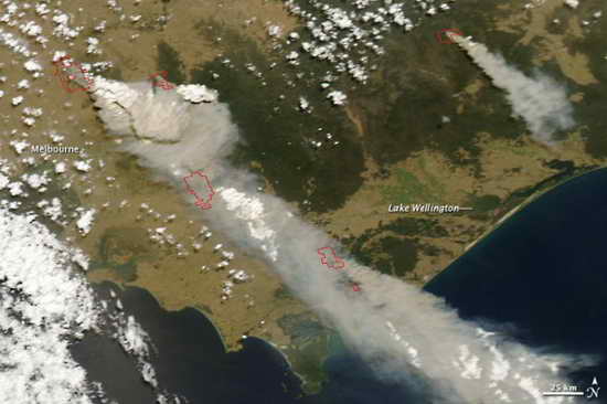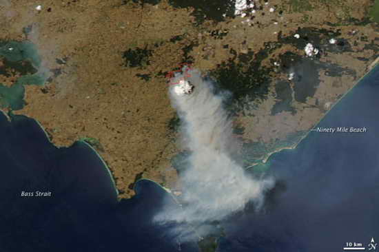 美國宇航局“阿卡”(取自拉丁文,意思是“水”。)衛(wèi)星中分辨率成像光譜儀所拍攝到的衛(wèi)星圖片反映了澳大利亞維多利亞州2月7日的山火情況,維多利亞州有多處發(fā)生山火(用紅色標出)。由于受到大風的影響,大團煙霧正向東南方擴散。澳大利亞東北部的內(nèi)陸沙漠正在刮沙塵暴。新聞報道稱,這些山火是在數(shù)小時內(nèi)出現(xiàn)并快速蔓延的。