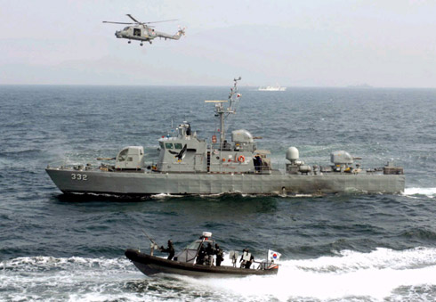 當(dāng)天,韓國型驅(qū)逐艦“文武大王艦”、一架反潛直升機(jī)和兩艘高速短艇和負(fù)責(zé)船舶搜查任務(wù)的海軍特種士兵參與了演習(xí)。