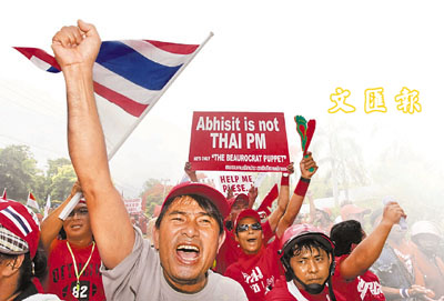 中新網(wǎng)4月11日電 據(jù)香港《文匯報(bào)》報(bào)道,為期3天的東盟與對(duì)話(huà)國(guó)系列峰會(huì)10日傍晚在度假勝地帕塔亞揭幕,泰國(guó)緊張局勢(shì)隨之升級(jí)。2000多名反政府“紅衫軍”沖破軍警封鎖線(xiàn),在會(huì)議場(chǎng)地外面與軍警對(duì)峙數(shù)小時(shí)。