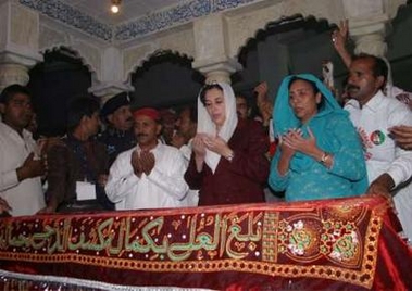 中新網(wǎng)10月28日電 巴基斯坦前總理貝·布托27日返回祖籍老家祭拜父親陵墓。這是她9天前返國遭炸彈襲擊以來首次公開旅行。