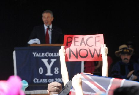 布萊爾在抵達(dá)耶魯大學(xué)遇到了一小群示威者,他們揮動著寫有“對布萊爾說不”、“耶魯!不要支持一名戰(zhàn)犯”的標(biāo)語牌,警方?jīng)]有讓這些示威者進(jìn)入講演會場。講演是在一個(gè)有門的大花園內(nèi)進(jìn)行的。但當(dāng)54歲的布萊爾走上主席臺時(shí),一些學(xué)生展示了紅色的標(biāo)語,上面寫著“現(xiàn)在就實(shí)現(xiàn)和平”、“不要戰(zhàn)爭”。學(xué)生是將這些標(biāo)語放在畢業(yè)袍里帶進(jìn)會場的。一名戴著頭巾的女學(xué)生在布萊爾講演時(shí)一直站著,她在距布萊爾約3米遠(yuǎn)的地方舉著“現(xiàn)在就要和平”的標(biāo)語。布萊爾看起來非常努力地不去看那名女學(xué)生。布萊爾在講演時(shí)也未直接提到伊拉克,他在講演時(shí)談到了氣候變化的問題、由宗教加劇的恐怖主義。布萊爾將于明年在耶魯大學(xué)開信仰和全球化課程。