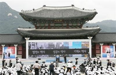李明博15日在景福宮廣場舉行的光復節(jié)紀念儀式上發(fā)表演講。