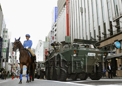 在中央?yún)^(qū)的銀座地區(qū),道路被封鎖,警察和消防隊(duì)員使用繩索和云梯車從百貨店等大樓內(nèi)營(yíng)救“受困者”。自衛(wèi)隊(duì)員駕駛裝甲車和救護(hù)車從地鐵站內(nèi)救出旅客并轉(zhuǎn)移到安全場(chǎng)所。警視廳的騎警隊(duì)也參加了演習(xí)。