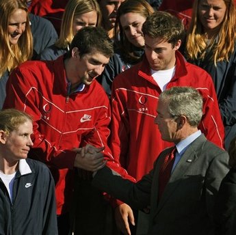 但和菲爾普斯握手時,布什的臉色很難看。有消息證實(shí),這是由于菲爾普斯沒有選擇他的女兒芭芭拉做女友,而是選擇了前加州選美亞軍妮可·約翰遜。布什不僅絕口不提把女兒嫁給他的事,也沒把芭芭拉帶到現(xiàn)場。