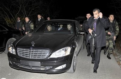 載有薩卡什維利的汽車在大批保安掩護(hù)下撤離槍擊事件現(xiàn)場(chǎng)。