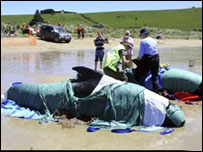 營(yíng)救人員試圖救助在澳大利亞塔斯曼尼亞島上擱淺的導(dǎo)航鯨